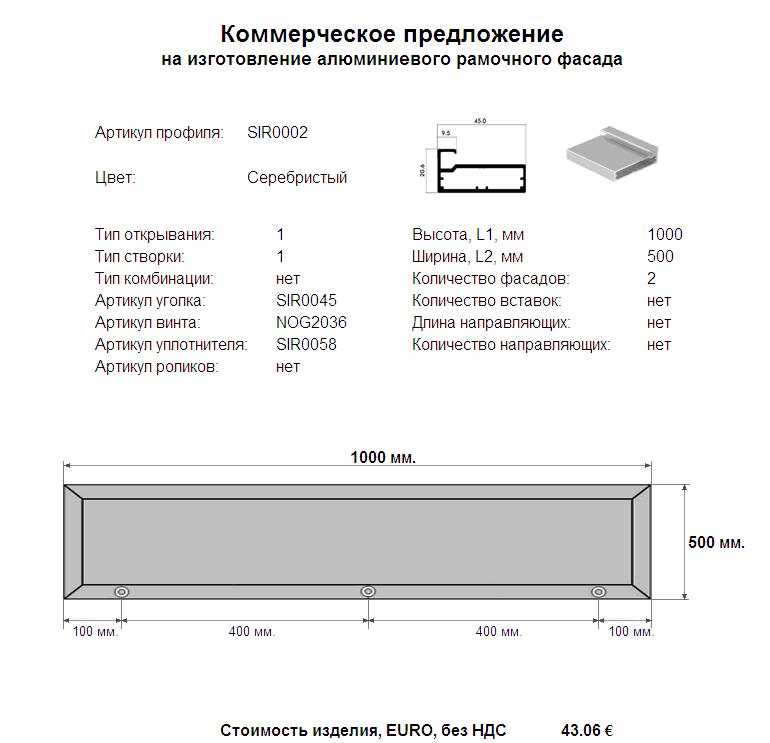 В открывшемся интерфейсе необходимо заполнить или выбрать параметры всех полей для расчета простого раздвижного фасада и дополнительно заполнить поле «Артикул вставки» и указать количество вставок. Одновременно с указанием количества вставок на чертеже изделия появятся указанное количество вставок и потребуется ввести значения расстояний от края фасада до середины крайней вставки или между серединами вставок, например: