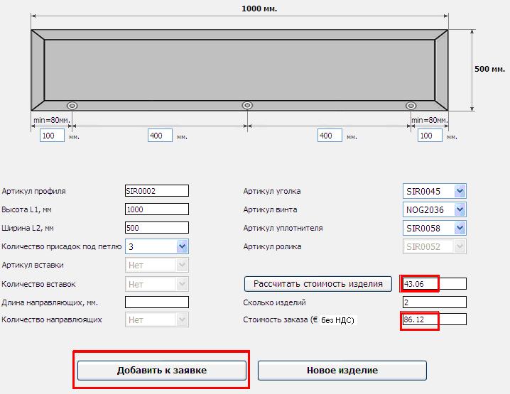 Для расчета стоимости изделия и стоимости заказа требуется нажать на кнопку «Рассчитать стоимость изделия». В результате расчета в соответствующих полях появится стоимость за 1 изделие(в Евро без НДС) и общая сумма по заказанному количеству изделий(в Евро без НДС).