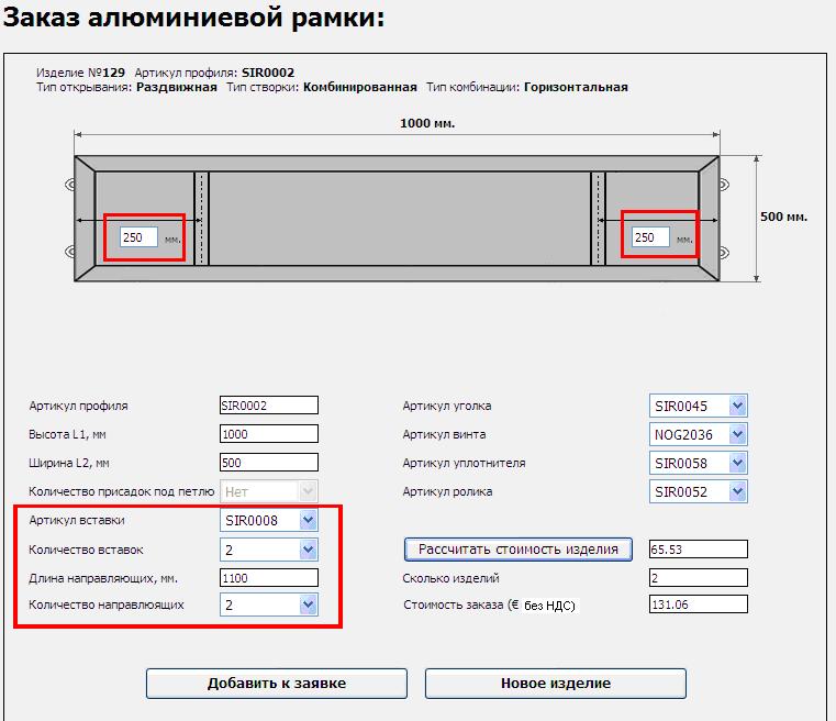 Далее необходимо ввести длину направляющих и общее количество направляющих в изделии(это количество не умножается на количество заказанных рамок, а задается отдельно, как правило, это значение кратно либо равно двум: верхняя и нижняя направляющие). Артикул ролика в заказе установлен по умолчанию, также по умолчанию фрезеруется расстояние под ролики (около 100 мм от края).