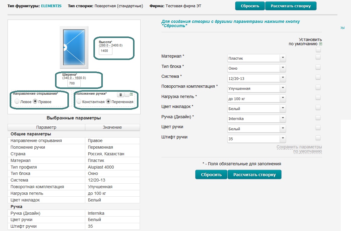 После заполнения всех полей формы и нажмите наа кнопку «рассчитать створку».