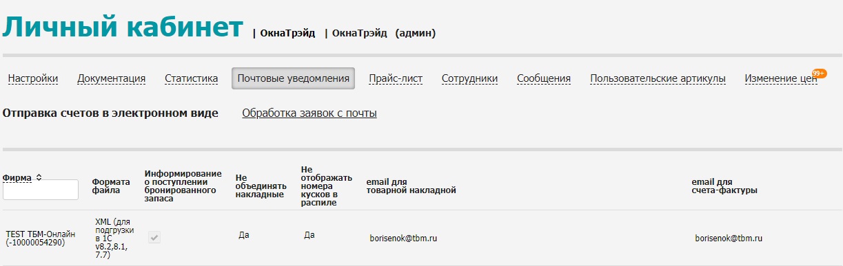 автоматически отправляемых почтовых уведомлений об обработке файлов с заявками. На данной странице мы можем обратится к следующему функционалу: